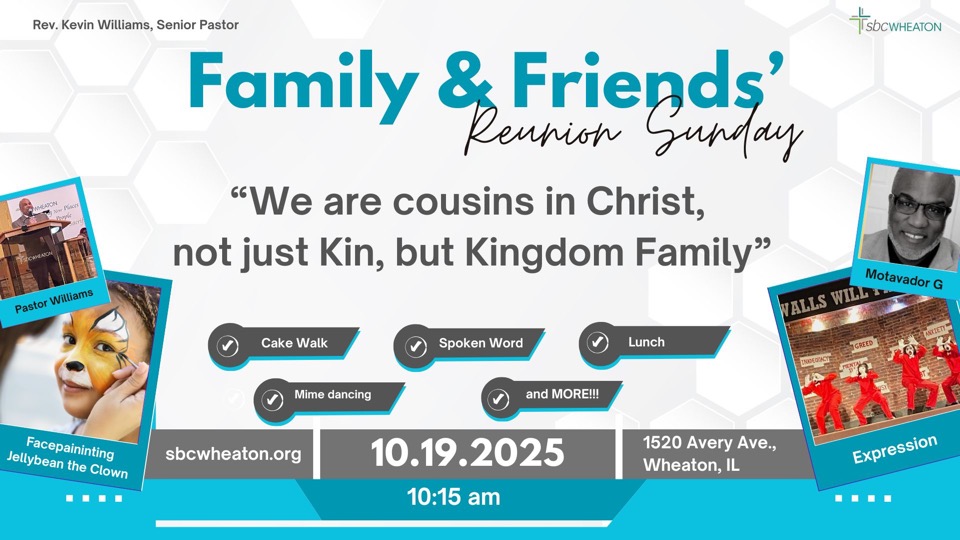 Family, you’re invited to SBC Family & Friends’ Reunion Sunday! We’re cousins in Christ—not just kin, but Kingdom family. Join us on Sunday, October 19, 2025 at 10:15 a.m. Come expecting joyful worship, uplifting music, powerful mimers, moving spoken word, and a Spirit-filled message from Senior Pastor Kevin Williams. After service, stick around for fellowship, delicious food, and fun for all ages—this reunion won’t be like any other! Dress code: T-shirt & jeans. Bring a friend (or three), find your seat (it’s already saved), and make yourself at home. If you have questions contact Pam Taylor, Shirley Brown, or Cynthia Perkins. We can’t wait to celebrate with our Kingdom family!