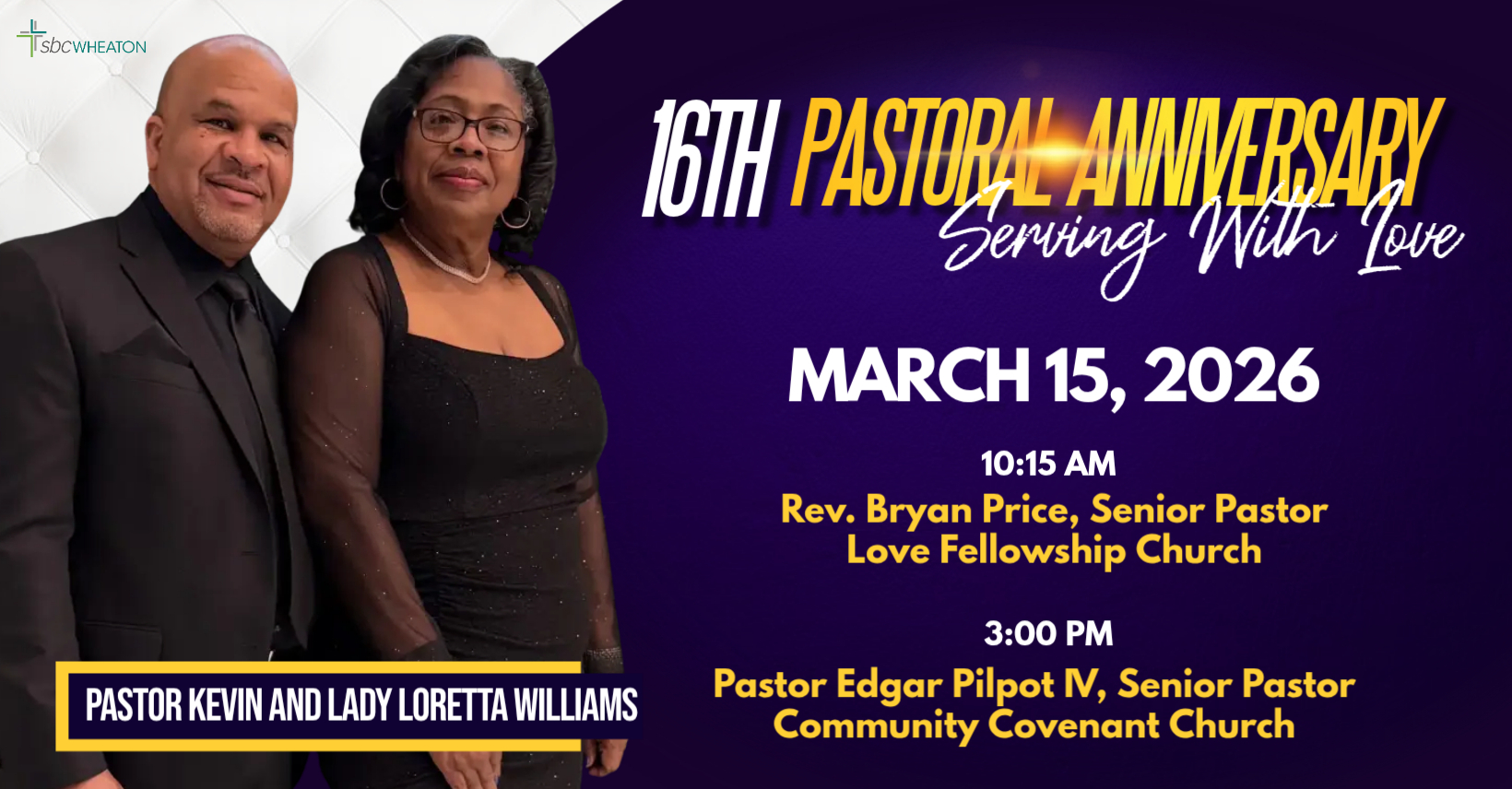 “Serving With Love”. The 16th Anniversary of our Pastor and First Lady is Sunday, March 15, 2026. Rev. Bryan Price, the Senior Pastor of the Love Fellowship church of Romeoville, will kick off the celebration at the 10:15AM service. The celebration will continue at 3PM with Pastor Edgar Pilpot IV and the Community Covenant Church will be our guests. The colors are royalty purple and gold. We will be celebrating the Best that Is Yet To Come. Please plan to join us for this blessed celebration.