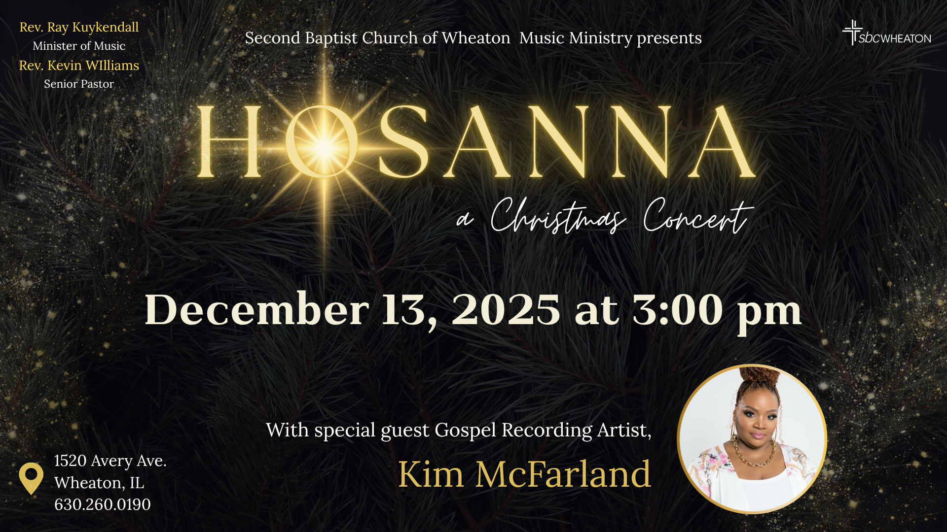 The Music Ministry of SBC presents “HOSANNA”, A Christmas Concert honoring the Birth of our Lord and Savior, Jesus Christ, on Saturday, December 13, 2025 at 3:00 P.M. here at SBC (1520 Avery Ave., Wheaton, IL). Gospel Recording Artist and Vocal Arranger Kim McFarland is our special guest. McFarland’s works can be found on YouTube Music, Apple Music, Instagram and more. Join Rev. Ray Kuykendall and the Music Ministry of SBC in an anointed afternoon of praise.