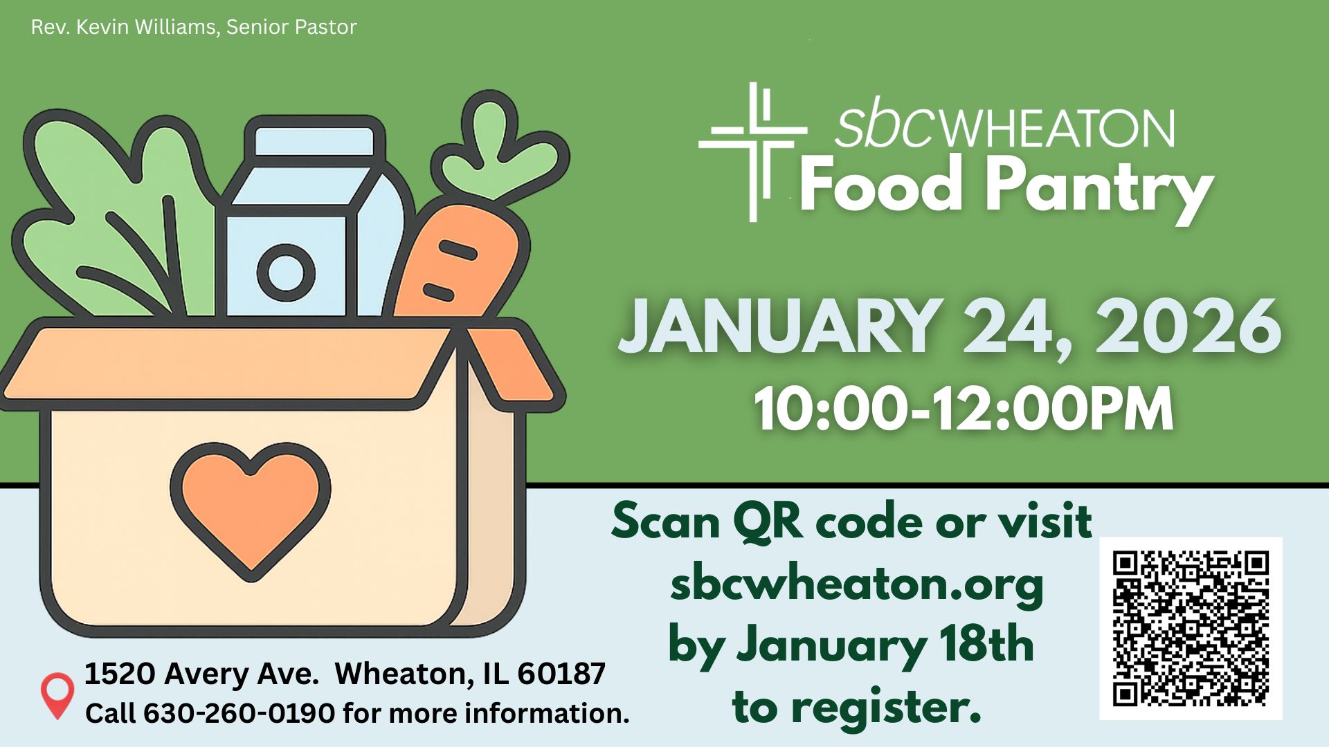 The SBC Food Pantry will be open on Saturday, January 24, 2026, from 10:00 a.m. to 12:00 p.m.